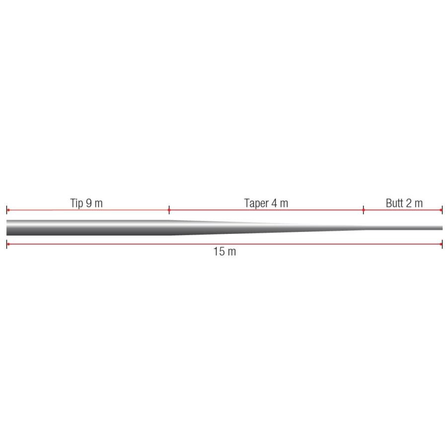 Wenn es darum geht, größere Entfernungen zu erreichen, ist die Verwendung von Weitwurf-Vorfächern sehr nützlich, und eines der brillantesten Mitglieder dieser Kategorie ist das TF XPS MATCH TAPER LEADER, das transparent und schnell sinkend ist. Dieses Vorfach ist 15 Meter lang und hat ein spezielles Design. Die Seite, die zur Montage zeigt, beginnt mit einem dickeren 9m-Abschnitt. Diese Länge reicht aus, um den anfänglichen großen Kräften beim Wurf standzuhalten, so dass große Entfernungen ohne Verlust der Montage erreicht werden können. Diesem Abschnitt folgt ein 4m langer Übergangsabschnitt, der den dickeren Durchmesser in die dünnere Seite überführt, die zur Hauptschnur passt. Die Seite des Vorfachs, die zur Hauptschnur zeigt, ist 2m lang, zu diesem Zeitpunkt hat sich unser Vorfach auf die Größe der Hauptschnur verjüngt, so dass es mit Hilfe eines Knotens an die Hauptschnur gebunden werden kann.