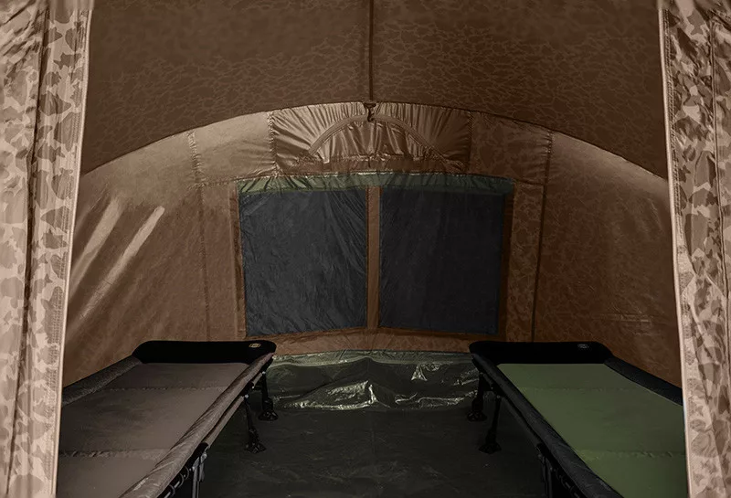 Dank seiner Abmessungen bietet das Zelt problemlos Platz für 2 Betten und lässt gleichzeitig viel Bewegungsfreiheit sowie Platz für Taschen und andere Ausrüstung, die für einen angenehmen Aufenthalt am Wasser benötigt wird. Bei Bedarf kann der Innenraum sogar 3 Betten aufnehmen. Natürlich gibt es auch zwei Halterungen zum Befestigen von Ruten und ein großes Vordach, das Schutz vor Sonne oder Regen bietet. Im Zelt befinden sich an der Decke 2 Haken, an denen beispielsweise eine Lampe aufgehängt werden kann.