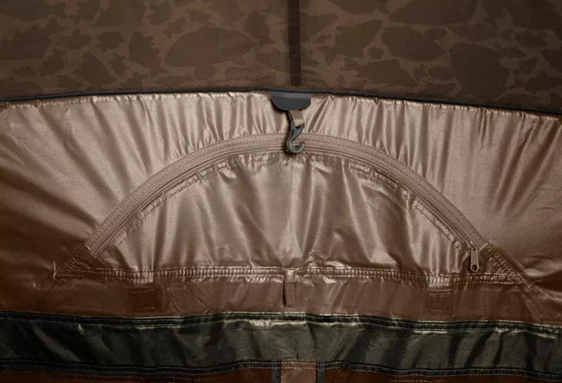 Die extra starke Garagenstruktur mit drei Rippen garantiert kompromisslose Stabilität bei jeder Wetterlage. Das hochwertige Material widersteht zusammen mit den vollständig versiegelten Nähten auch starken Stürmen, Wind und großen Niederschlagsmengen. Ein unbestreitbarer Vorteil des Zeltes ist das Gewebe im beliebten CARPATH-Muster, das Liebhaber dieses originellen Tarnmusters sicherlich begeistern wird.