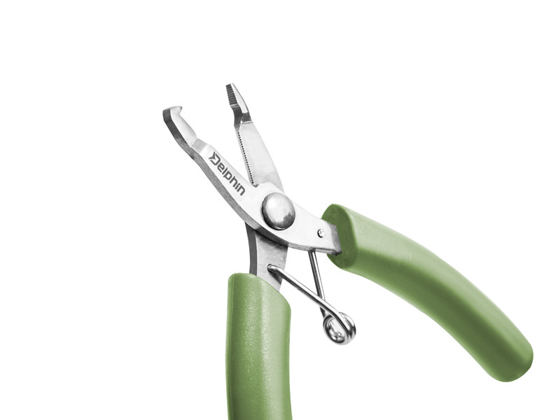 Praktische, multifunktionale Zange aus rostfreiem Stahl, deren Griffe für besseren Halt gummiert sind. Die Delphin MINI schneidet mühelos geflochtene Schnüre, Angelschnüre, aber auch Aramid (Kevlar) Draht. Die Mikro-Zähne an der Innenseite der Backen verhindern ein Verrutschen, wodurch ein sauberer, glatter Schnitt entsteht. Die Zange kann zum Öffnen von SPLIT RINGS und zum Anbringen von Bleischrot verwendet werden. Dank ihrer universellen Einsetzbarkeit kann sie bei allen Angeltechniken verwendet werden.