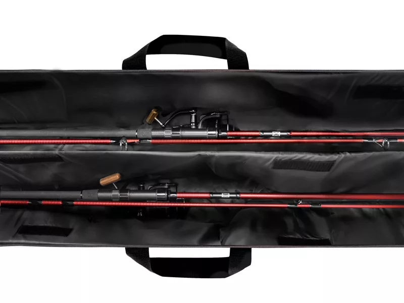 Das Rutenfutteral ist grün mit schwarzen Accessoires, aus einem sehr widerstandsfähigen Material gefertigt, das problemlos kleinerem Regen oder Feuchtigkeit durch Tau standhält. Der untere Teil besteht aus widerstandsfähigem, wasserdichtem Material, so dass es ohne Probleme auf nassen Boden gestellt werden kann. Alle Seiten des Rutenfutterals sind mit einer 6 mm dicken, weichen Polsterung versehen, auch die Trennwand. So können auch beim Transport von zwei Ruten keine Schäden entstehen. Beide Fächer können oben mit Klettverschluss befestigt werden. Der Rollenbereich ist verbreitert, damit die Karpfenausrüstung gut hineinpasst, wobei auch an den 50 mm Startring gedacht wurde.