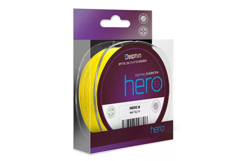 Die Delphin HERO 8 ist eine zuverlässige Schnur zu einem hervorragenden Preis, die durch das systematische Flechten von 8 PE-Mikrofasern hergestellt wird. Dadurch erhält sie eine ausgezeichnete Tragkraft, nahezu keine Dehnung und eine wesentlich feinere Oberfläche im Vergleich zu 4-fädigen Schnüren. Darüber hinaus ist die Schnur oberflächenbehandelt, was die Wasseraufnahme verhindert. Dank der breiten Palette an angebotenen Durchmessern und Tragkräften ist die Delphin HERO 8 für die Herstellung von Endmontagen in den meisten Angeltechniken geeignet.