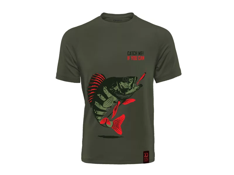 Das Catch me! BARSCH T-Shirt ist dunkelgrün und zeigt einen Barsch, der sich gerade dem Köder nähert, was der Traum eines jeden Anglers ist.