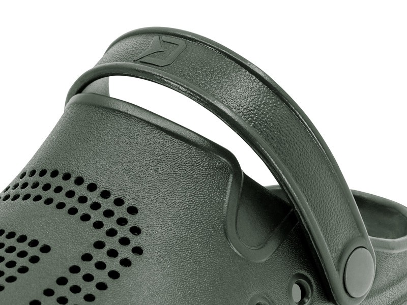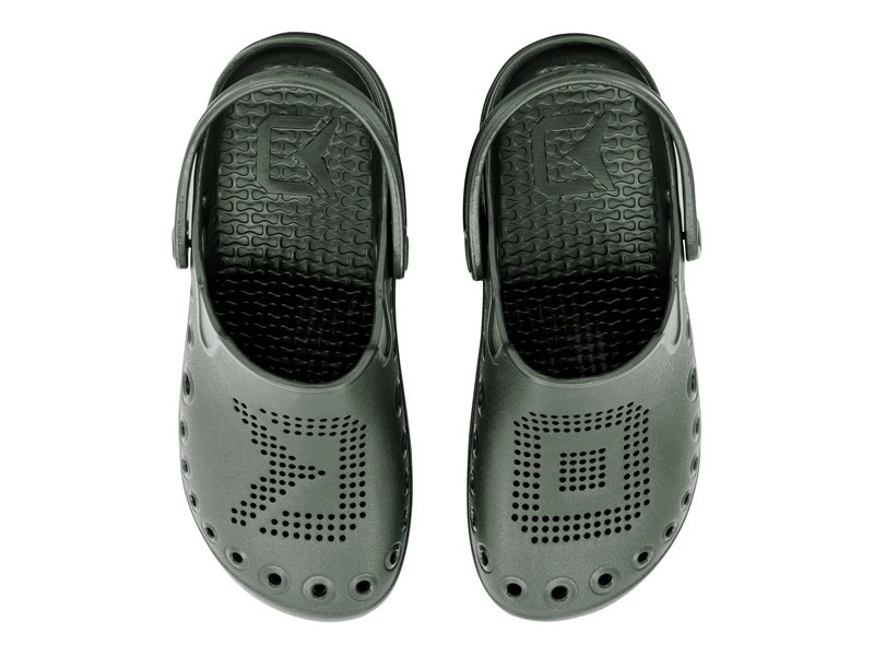 Die Geschichte der Namensherkunft von OCTO ist äußerst interessant. Wir haben sie mit der stilisierten Form von Oktopus-Tentakeln entworfen, die unter allen Bedingungen hervorragenden Halt bieten. Das englische Wort für Oktopus ist OCTOpus und das lateinische OCTOpoda; diese beiden Wörter inspirierten das Design und die Benennung, die wir kurz als OCTO festgehalten haben. Ein weiteres raffiniertes Detail sind die großen seitlichen Öffnungen, die hauptsächlich der Belüftung dienen. Sie sind bewusst nicht auf Sohlenhöhe platziert, wie es normalerweise der Fall ist, sondern etwas höher. Dies ist wichtig, da es verhindert, dass Sand oder Kieselsteine einfach zwischen Pantolette und Sohle gelangen, besonders wenn Sie am Strand oder im seichten Wasser sind. So können Sie sich sicher sein, dass Ihre Füße maximal geschützt sind. Darüber hinaus trägt die dichte Perforation im unteren Bereich zur Belüftung bei. Auf der einen Seite haben wir das D-Symbol aus dem Delphin-Logo verwendet, auf der anderen Seite den Buchstaben O, der der Anfangsbuchstabe des Namens OCTO ist. Die feine Textur auf der Oberfläche der Sohle, die an die Haut eines Tintenfisches erinnert, verstärkt den Gesamteindruck. Dank des EVA-Materials sind die Pantoletten extrem leicht, strapazierfähig und schwimmfähig. Selbstverständlich gehört zu diesem Modell auch ein Fersenriemen, der hilft, den Fuß zu fixieren, insbesondere bei der Verwendung in unebenem oder abschüssigem Gelände.