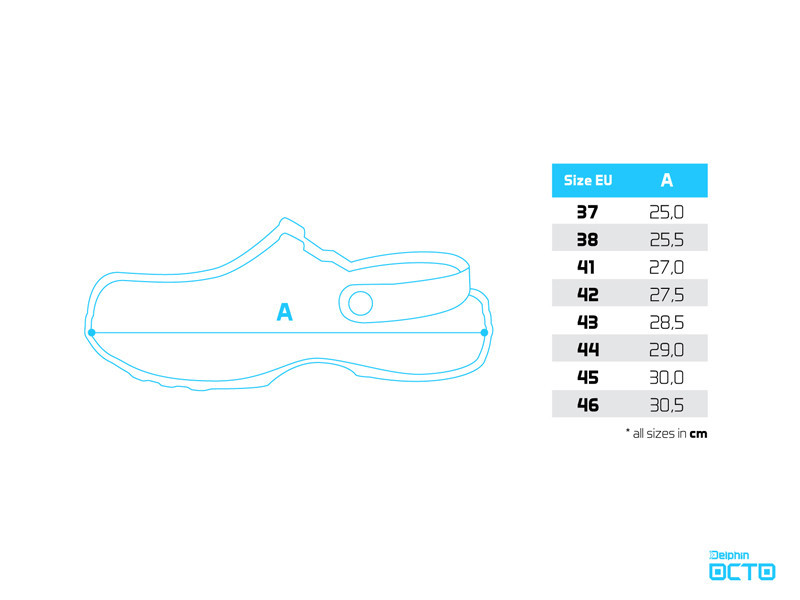 Die Geschichte des Namens OCTO ist äußerst interessant. Wir haben ihn mit der stilisierten Form von Oktopus-Tentakeln entworfen, die unter allen Bedingungen hervorragenden Halt bieten. Der Oktopus heißt auf Englisch OCTOpus und auf Latein OCTOpoda, diese beiden Wörter inspirierten das Design und die Namensgebung, die wir kurz als OCTO festhielten. Ein weiteres raffiniertes Detail sind die großen seitlichen Öffnungen, die hauptsächlich der Belüftung dienen. Sie befinden sich absichtlich nicht auf der Höhe der Sohle, wie es normalerweise üblich ist, sondern etwas höher. Dies ist wichtig, da es hilft zu verhindern, dass Sand oder Kieselsteine einfach zwischen den Pantoffel und die Sohle gelangen, insbesondere wenn Sie sich am Ufer oder in flachem Wasser aufhalten. So fühlen sich Ihre Füße maximal geschützt. Darüber hinaus trägt auch die dichte Perforation im unteren Bereich zur Belüftung bei. Auf der einen Seite haben wir das D-Symbol aus dem Delphin-Logo verwendet, auf der anderen Seite den Buchstaben O, der der Anfangsbuchstabe des Namens OCTO ist. Die feine Textur auf der Oberfläche der Sohle, die an die Haut eines Tintenfisches erinnert, verstärkt den Gesamteindruck. Dank des EVA-Materials sind die Pantoffeln extrem leicht, strapazierfähig und schwimmfähig. Selbstverständlich gehört zu diesem Modell auch ein Fersenriemen, der hilft, den Fuß zu fixieren, insbesondere bei der Verwendung in unebenem oder abschüssigem Gelände.