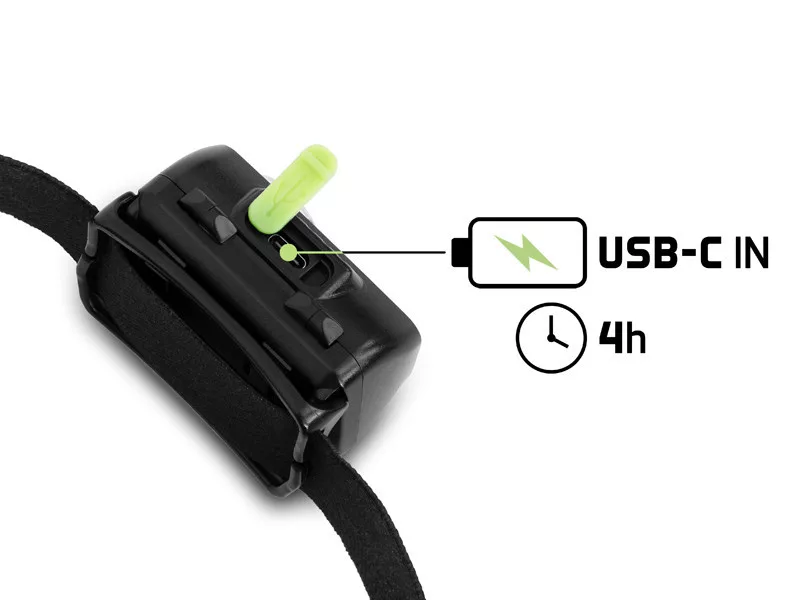 Die Stirnlampe wird von einem eingebauten 1200 mAh Akku betrieben, der mit einem USB-C Kabel geladen werden kann. Eine vollständige Aufladung dauert etwa 4 Stunden. Die Lampe verfügt auch über eine Ladeanzeige.