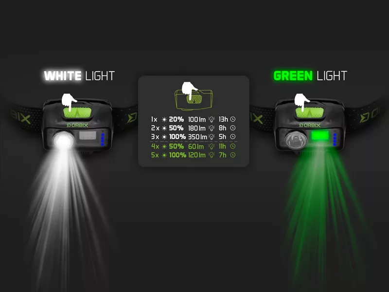 Zwei LED-Dioden sorgen für die Beleuchtung, wir können zwischen weißem und grünem Licht wählen. Beim ersten Knopfdruck schaltet sich ein 20%iges (100 lm) weißes Licht ein, das 13 Stunden lang leuchtet. Der zweite Knopfdruck liefert 50% Helligkeit, diese funktioniert 8 Stunden lang. Beim dritten Knopfdruck schaltet sich die maximale Helligkeit von 100% (350 lm) ein, die eine Betriebszeit von 5 Stunden gewährleistet.