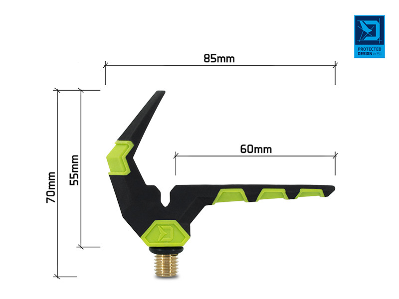 Zur Reduzierung der Schnurreibung und für eine bessere Schnurführung verfügt er zudem über eine Rille. Seine Oberfläche ist mit Gummimaterial beschichtet, das die Ruten vor Beschädigungen schützt. Dieser Rutenhalter ist aus robusten Materialien gefertigt, sodass er nicht leicht beschädigt oder zerkratzt wird. Er verfügt über ein Universal-Gewinde, das mit allen Standardarmen, Halterungen und Erdspießen kompatibel ist. Der gummierte Teil am Schaft des Halters verhindert dessen Verdrehen. Seine Gesamthöhe beträgt 55 mm, die Länge 85 mm.