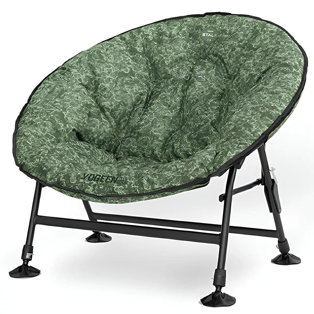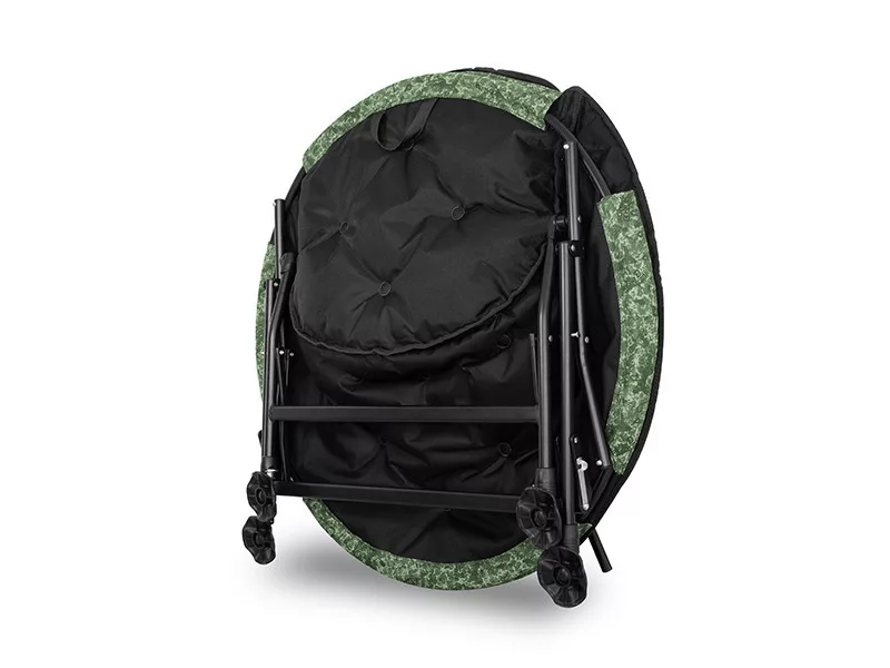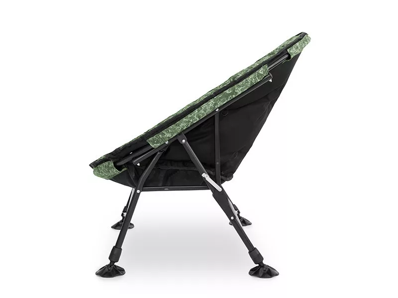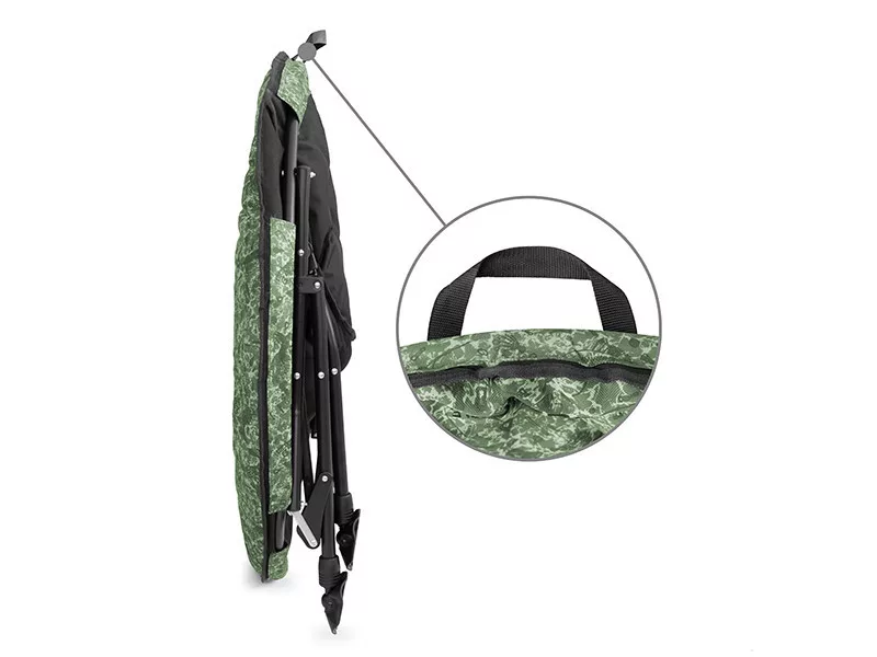 Die Oberfläche des Stuhls ist mit 600D-Gewebe in einem patentierten C2G-Tarnmuster versehen. Die Matratze ist innen und ringsum mit extra-dicker und weicher Polsterung ausgestattet. Neu ist der Griff an der Unterseite des Stuhls, der ihn leicht tragbar macht.