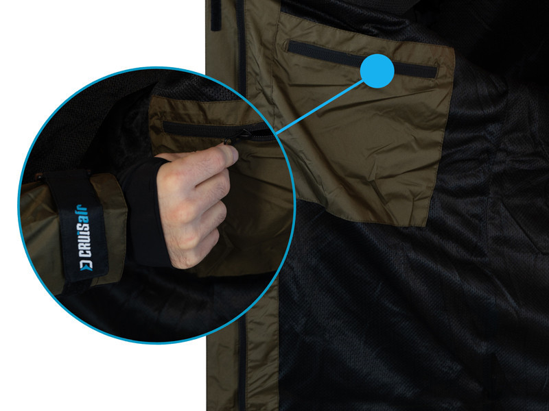 Die Innenseite der Jacke ist mit einem Netzgewebe versehen, das nicht nur angenehm auf der Haut liegt, sondern auch sicherstellt, dass die Haut nicht direkt mit dem Außenmaterial in Kontakt kommt. Dadurch erhöht sich der Tragekomfort erheblich, besonders bei längeren Angeltouren. Die innenliegende Reißverschlusstasche bietet eine praktische Lösung zur sicheren Aufbewahrung wichtiger Dokumente oder kleinerer Wertgegenstände. An der Außenseite der Jacke befinden sich zwei wasserdichte Reißverschlusstaschen, die den Inhalt zuverlässig vor Wassereintritt schützen, was bei einem Angelausflug unerlässlich ist.