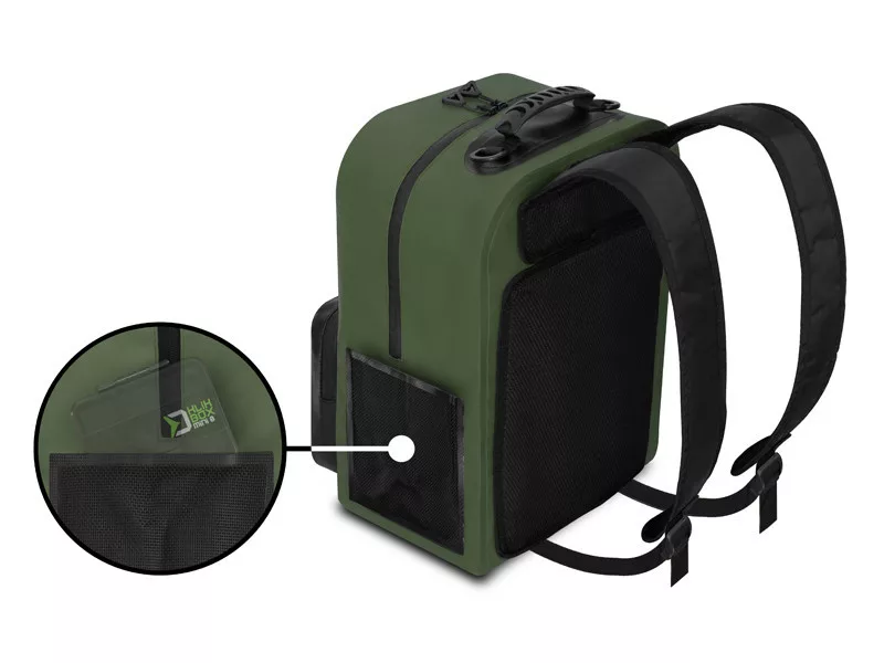 Der Rucksack verfügt über ein geräumiges Hauptfach, das durch praktische Seiten- und Fronttaschen ergänzt wird. Dank seines großen Fassungsvermögens passen problemlos Boxen unterschiedlicher Größe, Kleidung oder andere Ausrüstungsgegenstände hinein, die Sie trocken halten möchten. Die Seitentaschen eignen sich perfekt zur Aufbewahrung von zum Beispiel einer Trinkflasche oder Erdspießen.