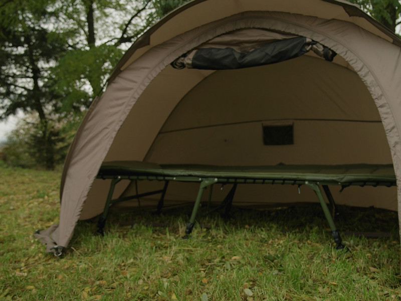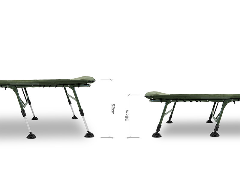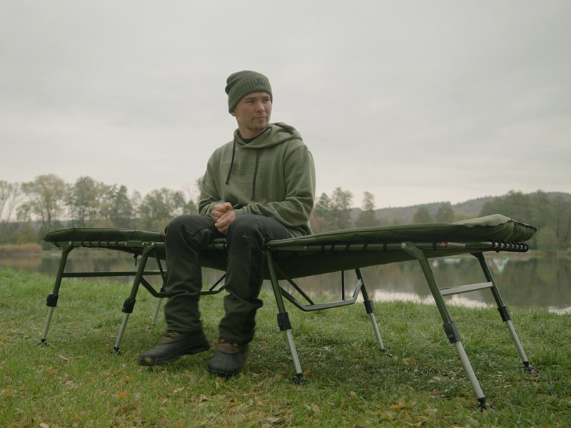 Das Angelbett ist auf einer starken, hochbelastbaren Metallkonstruktion aufgebaut, die intensivem Gebrauch standhält und dennoch leicht und einfach zu transportieren ist. Der Befestigungsmechanismus der Beinpaare am Kopfteil verhindert ein unerwünschtes Zusammenklappen und ermöglicht so einen sicheren und schnellen Aufbau. Die gesamte Oberfläche der Matratze ist mit weichem Fleece überzogen, das sich angenehm anfühlt und auch in kühlen Nächten ein warmes Gefühl vermittelt. Der Rand wird durch strapazierfähiges, olivgrünes 600D-Material geschützt, das abriebfest ist und eine lange Lebensdauer garantiert.