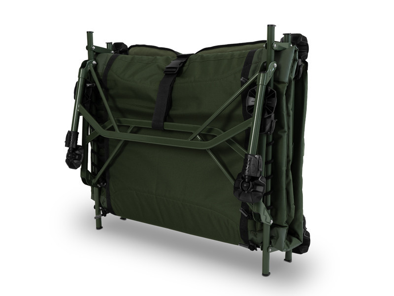 Das Angelbett lässt sich in wenigen Sekunden öffnen und zusammenklappen, so dass es schnell und mühelos verwendet werden kann. Für einen sicheren Transport sorgen abnehmbare, längenverstellbare Gurte, die mit robusten Kunststoffschnallen verschlossen werden – diese verhindern ein versehentliches Öffnen während des Transports.