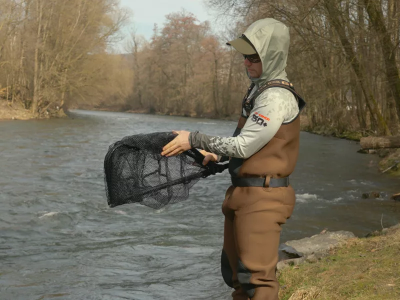 Stiel und Rahmen sind aus strapazierfähigem Metall gefertigt, das hohe Festigkeit und Langlebigkeit garantiert. Die Konstruktion bleibt dennoch leicht, sodass der Benutzer auch an längeren Angeltagen nicht überlastet wird. Der Rahmen ist mit einem gummierten Netz ausgestattet, das kein Wasser aufsaugt, wodurch die Entstehung unangenehmer Gerüche reduziert wird. Dank der gummierten Beschichtung lassen sich auch die Haken von Kunstködern leichter lösen, was besonders beim Spinnfischen von Vorteil ist. Die ausreichende Tiefe des Netzes sorgt dafür, dass auch größere Fische sicher im Netz bleiben, ohne herauszuspringen.