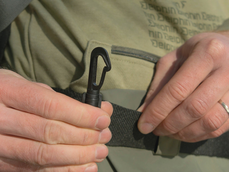 » Integrierter Karabiner mit einziehbarer Schnur zur bequemen Befestigung