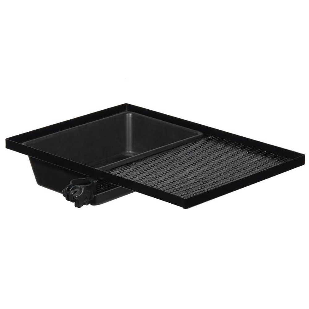 Die 51x36 cm große Seitenablage verfügt auf einer Seite über eine tiefe Schale, die nicht nur ideal zur Aufbewahrung von Ködern, Werkzeugen oder anderen kleinen Accessoires ist, sondern auch Wasser aufnehmen kann, um die Hände während des Angelns sauber zu halten – eine kleine, aber großartige Lösung zur Steigerung des Angelkomforts. Der perforierte Boden der Schale hilft, überschüssiges Wasser abzuleiten, sodass nichts darin stehen bleibt, schnell trocknet und keine feuchte, unangenehme Oberfläche entsteht. Der Rand ist sorgfältig gestaltet, um die Gegenstände sicher zu halten und ein versehentliches Herunterfallen zu verhindern, was am Wasser oft Ärger verursacht.
