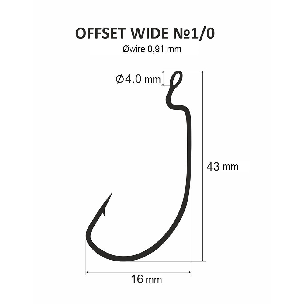 Der Hakenbogen hat ein spezielles Design, sodass die chemisch geschärfte, extrem scharfe Hakenspitze leicht im Köder versteckt werden kann. Um die Widerstandsfähigkeit gegen Kräfte zu erhöhen, wurden 2/3 der Hakenlänge geschmiedet. Der Haken ist mit einer speziellen Korrosionsschutzbeschichtung (schwarzer Chrom) überzogen, sodass er problemlos auch im Salzwasser verwendet werden kann. Das Design des Dnipro-Svinets Offset-Hakens ermöglicht das stabile Halten jeder Art von Silikonköder, sodass auch in dicht bewachsenen Gewässern bedenkenlos geangelt werden kann, ohne das Risiko, den Köder zu verlieren.