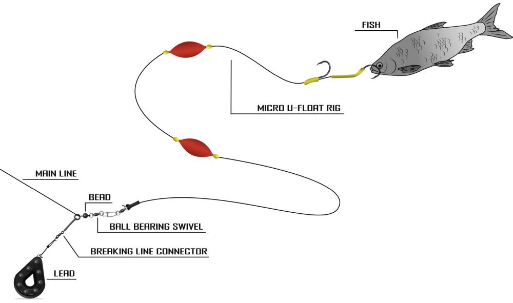 Stefan Seuß Waller Spezial Welsvorfach. Das Micro U-Float Rig ist die perfekte Lösung, um Köderfische und andere Naturköder in Grundnähe an Steinpackungen anzubieten. Zwei kleinere Posen sorgen für ein unauffälliges und sanftes Anheben des Köders, wodurch das Vorfach von scharfen Steinen und Muschelbänken ferngehalten wird. Der Köderfisch oder andere Naturköder wird mit zwei Einzelhaken am Haarvorfach fixiert. Das Micro U-Float Rig ist eine ausgezeichnete Lösung für das Angeln in kälteren oder stark befischten Gewässern.