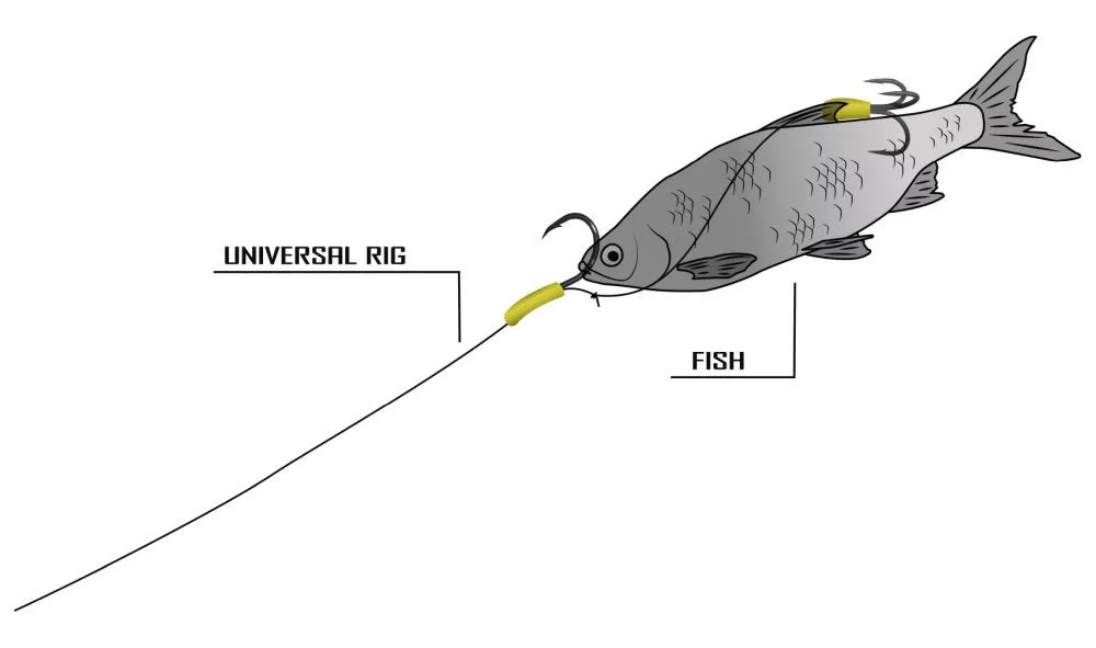 Stefan Seuß Waller Spezial Welsvorfach. Das Universal Rig ist die perfekte Lösung, um Köderfische und Naturköder für Bojen-, Posen- und Grundangelmethoden zu präsentieren. Das Vorfach besteht aus einem Einzelhaken und einem Drilling und ist schnell und einfach einsetzbar.