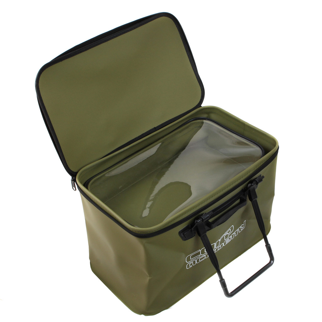 Der größte Vorteil der Tasche ist das vollständig transparente Oberteil, das es dem Angler ermöglicht, den Inhalt der Tasche ohne Öffnen einzusehen und somit schnell und einfach zu überprüfen. Dies ist besonders praktisch am Wasser, wenn jede Minute zählt. Die Größe von 38x25x9 cm bietet eine relativ große Kapazität, aufgrund ihres Designs passen jedoch nur zwei dieser Taschen bequem in die Carp Academy EVA Zubehörtasche (5306-002). Die grüne Farbe verleiht ein elegantes und naturnahes Erscheinungsbild, das gut zur Angelumgebung passt.