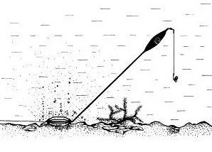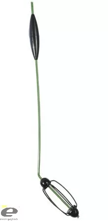 Dank des Auftriebs des Posenkörpers stellt sich die Tauchpose in einem Winkel von ca. 45° ein. Der lange Stiel (30 cm) hebt den Haken an, der in der sich auflösenden Futterwolke schwebt. Die Montage sinkt auch auf schlammigem Grund nicht ein. Die Montage wird einfach von der Seite des Rippenkorbs an der Hauptschnur befestigt.