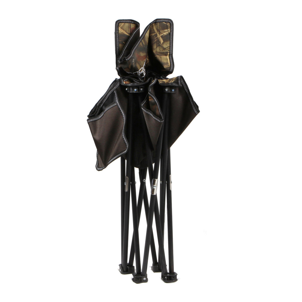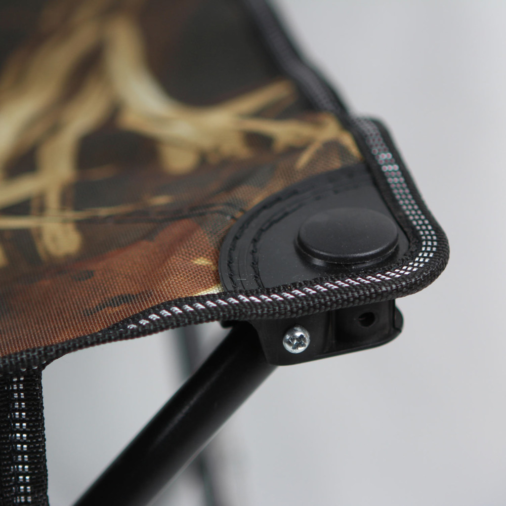 Der Bezug des Stuhls besteht aus 1600D Oxford Nylon, das extrem robust, abriebfest und langlebig ist. Das Tarpaulin-Gewebe ist nicht nur strapazierfähig, sondern verleiht dem Stuhl auch ein diskretes Aussehen, das sich perfekt in die natürliche Umgebung einfügt. Die Sitzfläche misst 45x38 cm, die Rückenlehnenhöhe beträgt 34 cm, was eine bequemere Sitzposition als die kleinere Promo-Variante bietet.