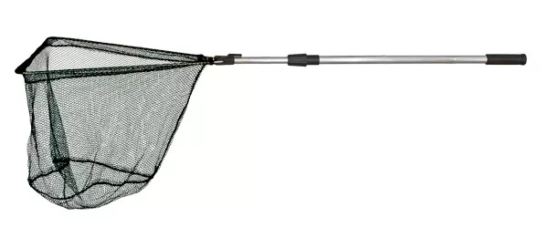 Klassischer Kescher, gefertigt mit einem dreieckigen Metallrahmen und einem robusten Netz. Der Kopf und der belastbare, gummierte Metallstiel mit sicherem Griffende sind ebenfalls klappbar.