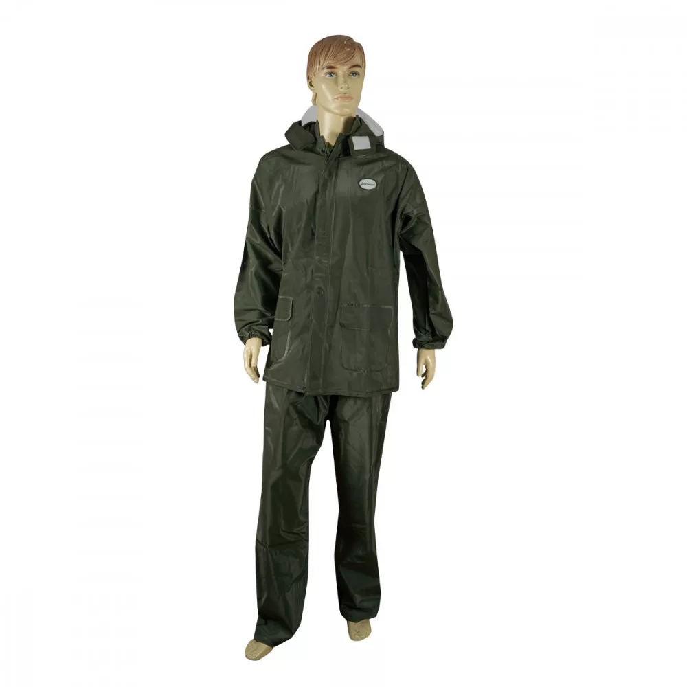 Das Produkt ist ein zweiteiliger (Hose + Jacke) Regenanzug aus widerstandsfähigem PVC-Material, der zu 100% verhindert, dass der Regen den Angeltag ruiniert!