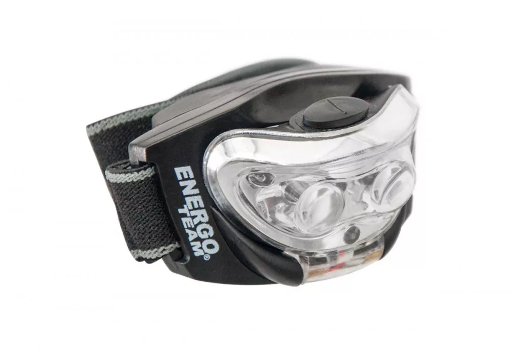 Praktische, spritzwassergeschützte Stirnlampe mit drei LEDs (zwei weiße und eine rote).