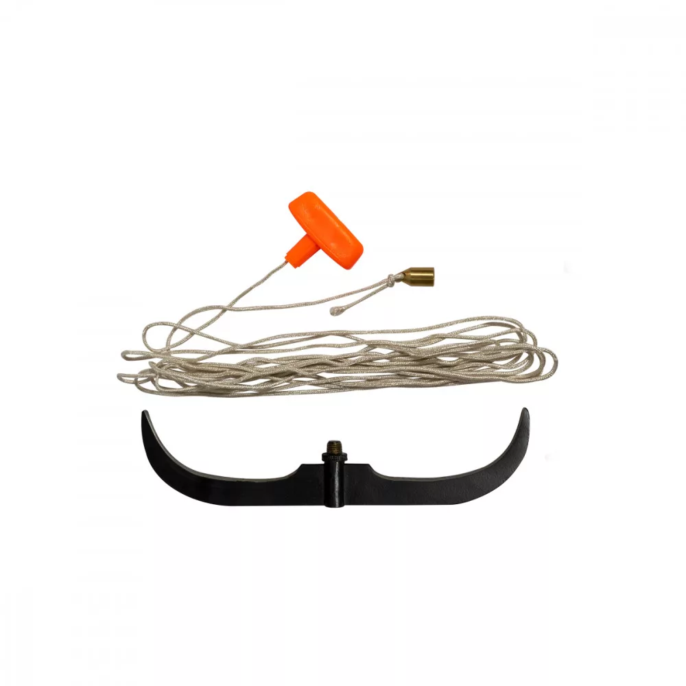 Zum Lieferumfang gehört auch eine Messing-Innengewindehülse, an deren Öse ein wirklich starkes Seilteil von 4,5 Metern Länge angeschlossen wird, mit einem Kunststoffgriff am Ende.