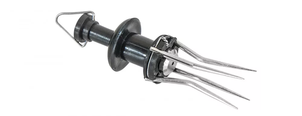 Legen Sie den Köderring auf die Zange, drücken Sie dann den mittleren Öffner nach innen, wodurch sich die kleinen Arme öffnen und das Gummi spreizen.