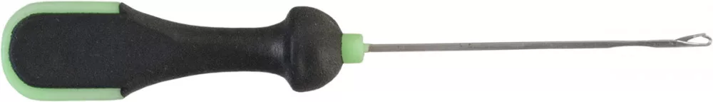 Wir verwenden diese Standard-Boilienadel, wenn wir den Köder nicht auf den Haken, sondern auf ein Haar-Rig ziehen möchten. Dabei schieben wir die Boilienadel durch den Köder, hängen dann die Schlaufe des Haar-Rigs in das Hakende der Nadel, ziehen anschließend den Köder unter den Haken, sichern ihn mit einem Stopper und schon ist das richtig präsentierte Vorfach für die Fische bereit.