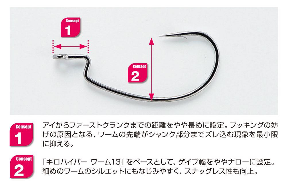 Dank des Offset-Designs sitzen Gummifische und andere Weichköder perfekt am Haken, sodass sie sich natürlicher im Wasser bewegen, während die Hakenspitze in der Vegetation und zwischen Hindernissen verborgen bleibt. Dadurch wird die Gefahr des Hängenbleibens minimiert, während die Anhiebsrate maximiert wird, wenn der Raubfisch zuschlägt.