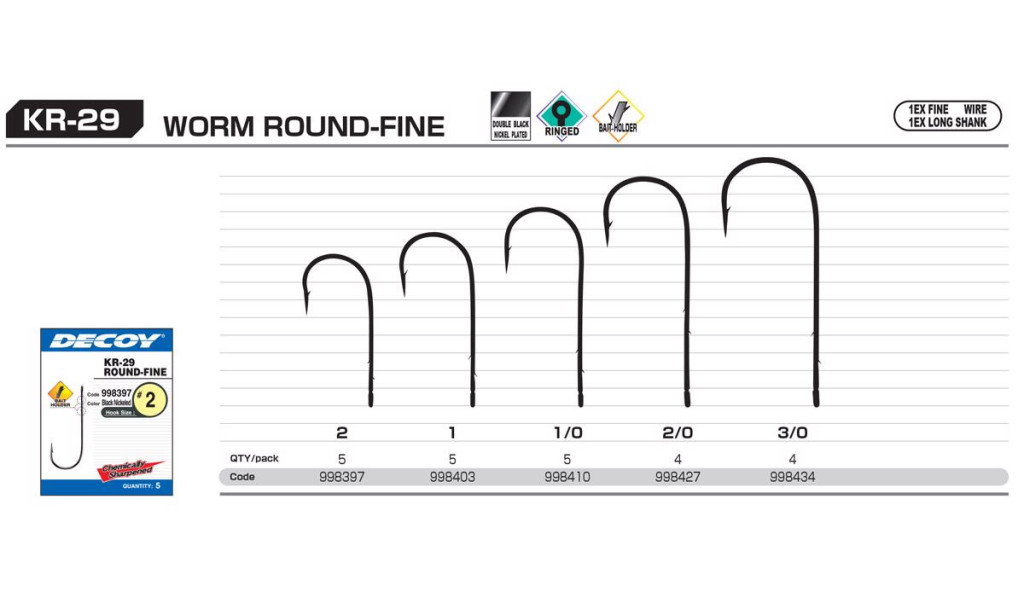 Der Decoy Worm KR-29 Round Fine 2/0 Geöster Widerhaken Einzelhaken für Raubfische ist die perfekte Kombination aus japanischer Präzision und Premium-Qualität, speziell entwickelt für das erfolgreiche Raubfischangeln.