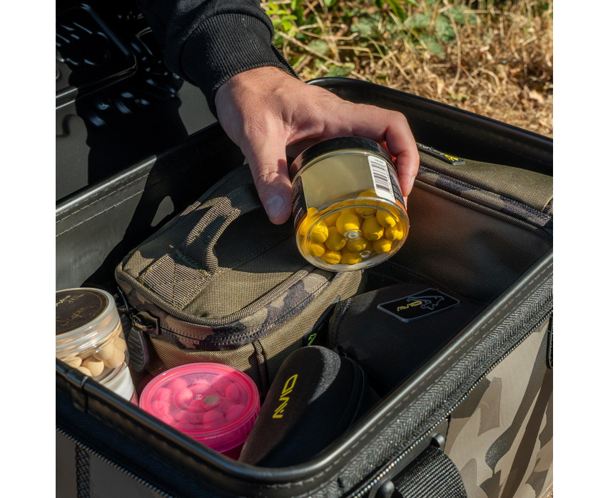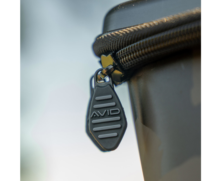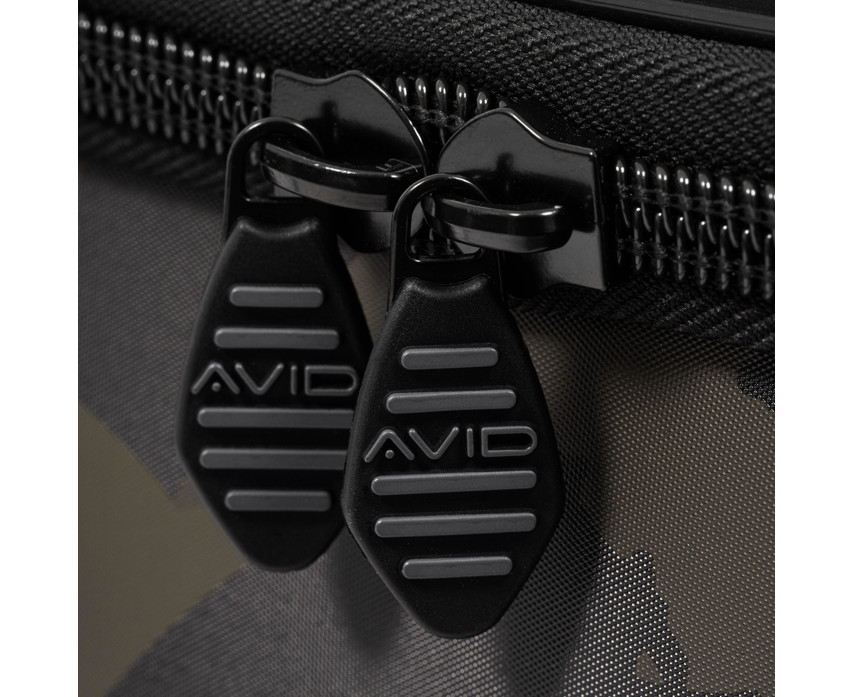 Die Außenhülle der Tasche trägt das bekannte Distortion-Camouflage-Muster, das hilft, sich in die natürliche Umgebung einzufügen, während der mit dem Avid-Logo versehene Deckel Qualität und Zuverlässigkeit symbolisiert. Die 10 mm dicken, abriebfesten Reißverschlüsse und der ergonomische Griff gewährleisten einen einfachen Zugang und eine lange Lebensdauer. Die Konstruktion besteht aus 1 mm dicken EVA-Seitenwänden und einem verstärkten, 1,5 mm dicken Boden, wodurch sie äußeren Einflüssen und Feuchtigkeit standhält. Die Polyester-Tragegurte mit Neopren-Griff ermöglichen einen bequemen Transport, auch über längere Strecken.