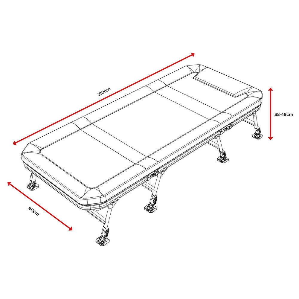 Präzisionsgefertigte Aluminiumscharniere gewährleisten die Stabilität und Haltbarkeit des Bettes. Mit 20.000mm wasserdichtem EX-Gewebe als Obermaterial. Dank des wasserdichten EX-Gewebes bietet das Bett auch bei starken Regenfällen effektiven Schutz. Das innovative LevelTech Beinsystem sorgt für eine ebene Liegefläche und hält das Bett stabil. Das TLS Holzdesign hilft, die Matratze völlig flach zu halten, wodurch der Komfort erhöht wird. Die luxuriöse Memory-Foam-Matratze bietet hervorragende Unterstützung und Komfort auch während langer Angelzeiten. Die wasserdichte Heavy Duty EX Oberseite bietet zusätzlichen Schutz für das Bett. Die zweilagige, wendbare Decke erhöht die Hygiene- und Komfortaspekte.
