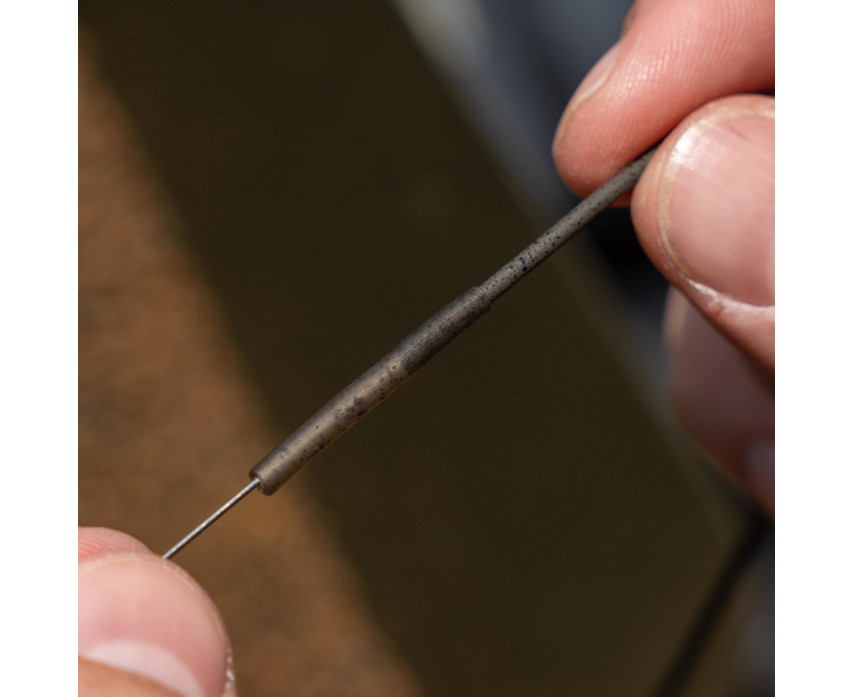 Die unauffällige grüne Grundfarbe und die unterschiedlich großen Tarnflecken helfen der Montage, sich in die Umgebung des Gewässergrunds einzufügen, wodurch die Argwohn der Fische verringert wird. Die Packung enthält auch ein kleines Draht-Einfädelwerkzeug, das das Einfädeln des Rohrs in die Anti-Tangle-Hülse erleichtert.