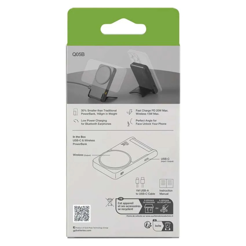 Der Packungsinhalt: 1 Stück GP Powerbank Q05B, 5000 mAh, 20 W+Wireless, Schwarz.