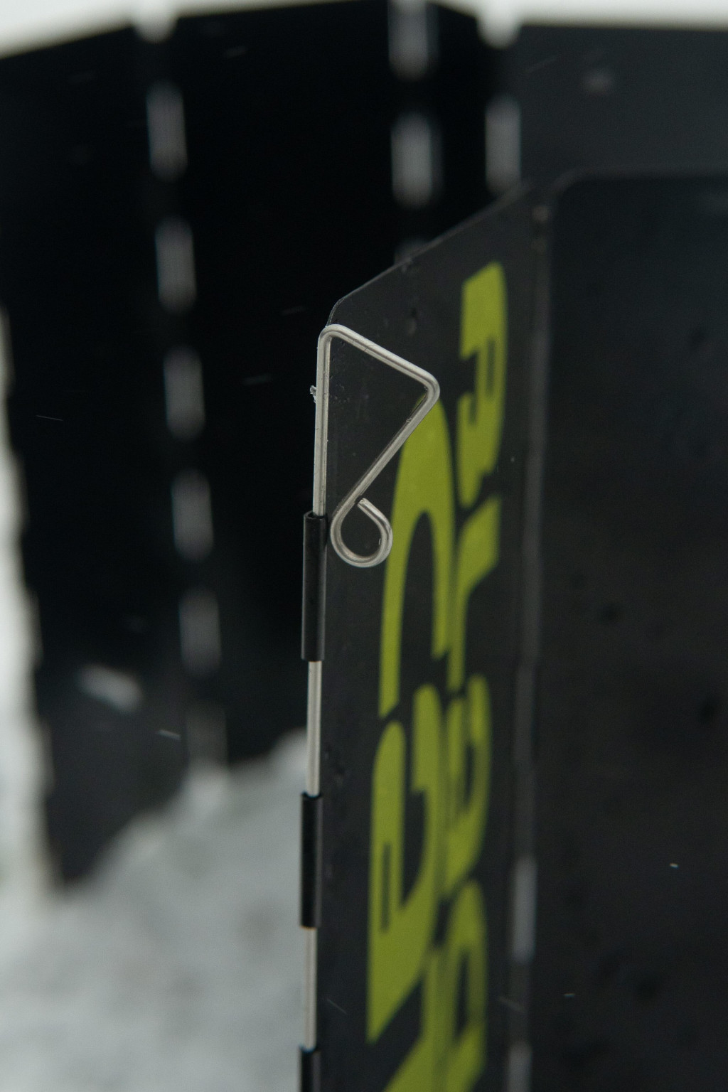 Der Windschutz hat ein siebenteiliges Design, das flexibel an verschiedene Herdgrößen angepasst werden kann. Die Paneele sind leicht beweglich, sodass die Form der Konstruktion an die Gegebenheiten angepasst werden kann. Die stabile Befestigung wird durch Erdspieße unterstützt, die auch auf weicherem Untergrund zuverlässigen Halt bieten, sodass der Wind den Schutzschild nicht verschieben kann.