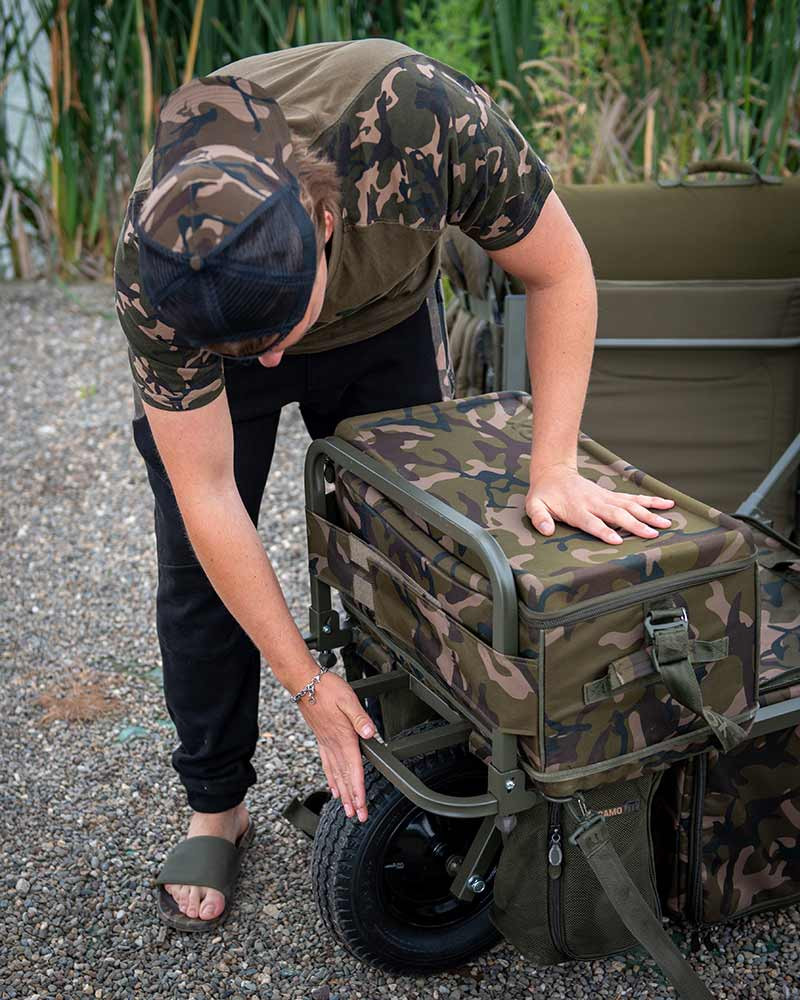 Zur Schubkarre gehört eine abnehmbare Under Barrow Bag Tasche im Fox Camo-Muster, die eine bequeme Aufbewahrung der benötigten Utensilien ermöglicht. Zwei seitliche Netztaschen befinden sich neben dem Rad und bieten idealen Platz für eine 5-Liter-Wasserflasche oder zur Aufbewahrung von Ködern und Futter. Die Tasche und die Taschen sind mit Reißverschlüssen verschließbar, sodass der Zugriff auf den Inhalt einfach und schnell ist, selbst wenn die Schubkarre voll beladen ist.