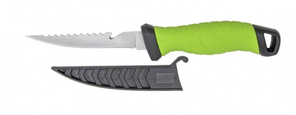 Ein Messer mit modernem Aussehen, gezacktem Rücken, steifer und dennoch extra scharfer, strapazierfähiger Klinge, hergestellt aus rostfreiem Stahl mit einem leicht zu reinigenden Kunststoffgriff. Um Unfälle zu vermeiden, wird es mit einer Kunststoffscheide geliefert, die auch die Klinge des Messers schützt. Perfekte Wahl zum Angeln, aber auch für den täglichen Gebrauch in der Küche. Die Klinge ist 12,5 cm, der Griff 14,5 cm lang.