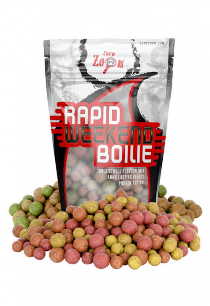 rapid weekend boilies Schnell wirkender Boilie. Boilies zum Anfüttern, aber aufgrund ihrer Qualität auch als Hakenköder verwendbar, für Angler, die kürzere Zeit, z.B. ein Wochenende, am Wasser verbringen, dafür ist ein schnell wirkender Boilie unerlässlich, um erfolgreiches Angeln zu gewährleisten. Erhältlich in optimaler 2,5 kg Packung, zu einem unschlagbaren Preis. Eine Packung enthält mehrere Geschmacksrichtungen und Größen.