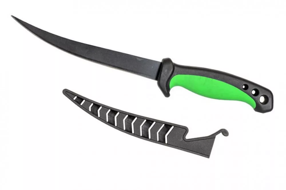 Flexibles und dünnes, gleichzeitig extra scharfes, strapazierfähiges Filetiermesser mit modernem Aussehen. Gefertigt aus antihaftbeschichtetem Edelstahl, mit einem leicht zu reinigenden Kunststoffgriff. Zur Vermeidung von Unfällen wird es mit einer auf den Griff aufsteckbaren Kunststoffhülle geliefert, sodass das Messer nicht herausfällt und sowohl den Benutzer als auch die Klinge schützt. Perfekte Wahl zum Angeln, aber auch für den alltäglichen Küchengebrauch.