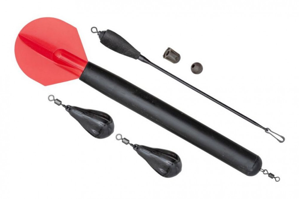 Komplett ausgestattetes Markerbojen-Set, das neben dem Marker zwei tropfenförmige Bleie, Gummi-Stopper und eine Haltefaser enthält, die bei schlammigem Untergrund verwendet werden kann. Eines der Enden dieser Faser ist leichter gemacht, wodurch die Schnur vom Gewässergrund abgehoben wird und nicht zusammen mit dem Blei im Schlamm versinkt, sodass die Schnur widerstandslos hindurchgleiten kann.