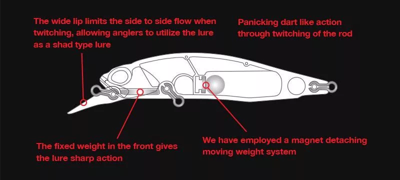 Darüber hinaus kann der Köder auch als Shad-Köder mit panischer Darting-Bewegung verwendet werden, die durch leichtes Zucken der Rute erreicht wird. Dies ermöglicht es Anglern, Bisse von Barschen auch aus kürzester Entfernung zu erhalten. Dieser Köder ist die perfekte Wahl für das lineare, gerade Einholen und auch für das "Spot-Light"-Angeln, wobei seine panische Darting-Bewegung das Angeln unterstützt.