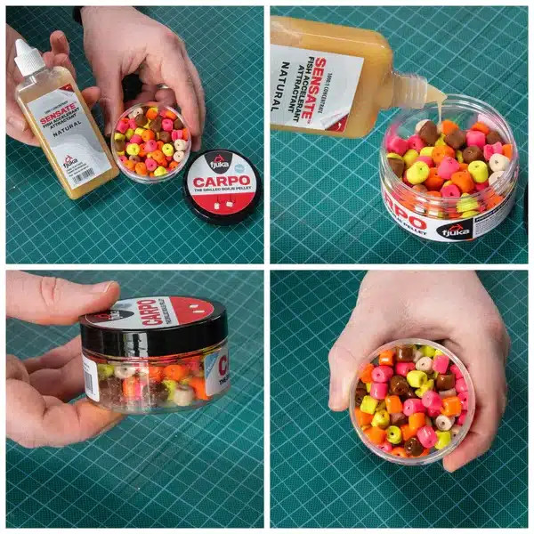 Die Aromen des Fjuka Sensate Fish Accelerant Attractant Natural werden von sehr feinen – nur 0,4 Mikrometer im Durchmesser – Lebensmittelpartikeln getragen, was 0,4 Tausendstel Millimeter bedeutet. Wenn Sensate™ also das Wasser erreicht, verteilen sich diese Partikel sofort und bilden eine Duftwolke und eine starke Geschmacksspur im Köder.