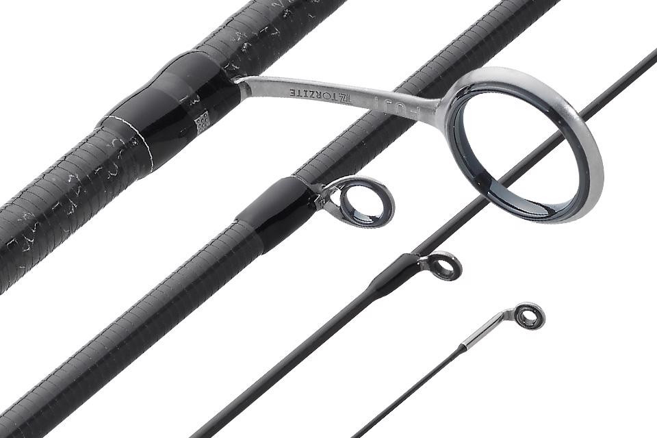 Die Spitze ist mit einem titanumrahmten SiC-S Ring ausgestattet, während Spitze, Griff und Handteil leichte titanumrahmte Torzite Ringe verwenden, um das Gewicht der Rute zu reduzieren.