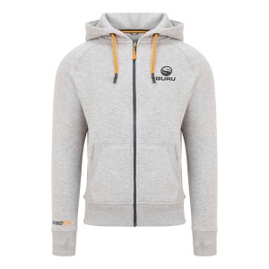 Bequemer grauer Kapuzenpullover mit Reißverschluss und Fleecefutter. Verfügt über ein Guru Logo auf der Vorderseite und eine Aventus/Guru Grafik auf der Rückseite.  Mit zwei offenen Taschen.