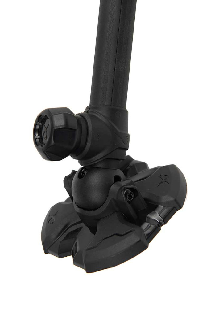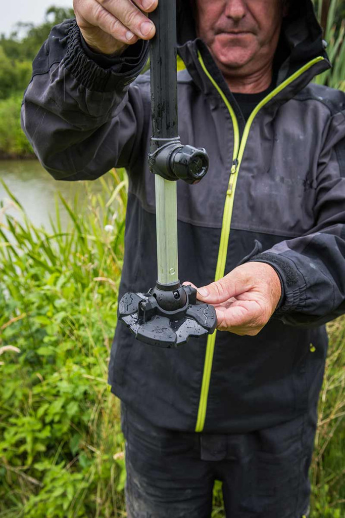 Das Bein ist mit Gewinde-Endkappen ausgestattet, die eine starke Befestigung gewährleisten, während die großen, um 360° drehbaren Schlammteller maximale Stabilität auf unebenem oder weichem Untergrund bieten. Diese Schlammteller verteilen das Gewicht, sodass der Stipprutenkasten nicht einsinkt, was in sumpfigen oder schlammigen Umgebungen besonders wichtig ist.