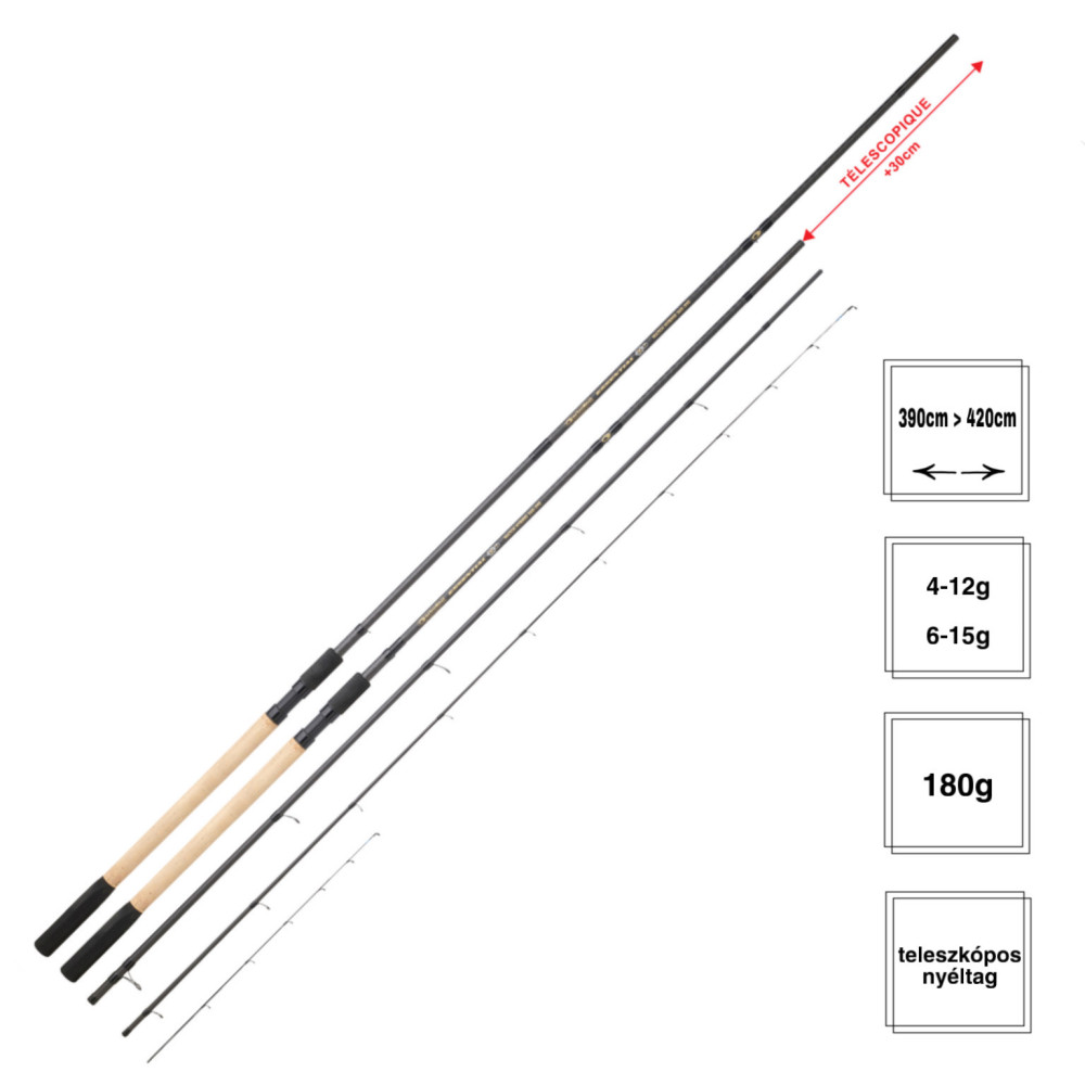 Erhältlich in zwei Typen: 360-390cm 3-8gr (4-12gr) und 390-420 cm 4-12gr (6-15). Jede Rute ist eine sehr feine, echte Brassenrute. Das Blankdesign und die Aktion ermöglichen die Verwendung von kleinen Haken und sehr dünnen Vorfächern. Eine der fantastischsten Eigenschaften dieser Ruten ist, dass sie ZWEI austauschbare Vollcarbon-Spitzen haben, die wir je nach Bedarf wechseln können, je nachdem ob wir eine stärkere oder eine schwächere benötigen.